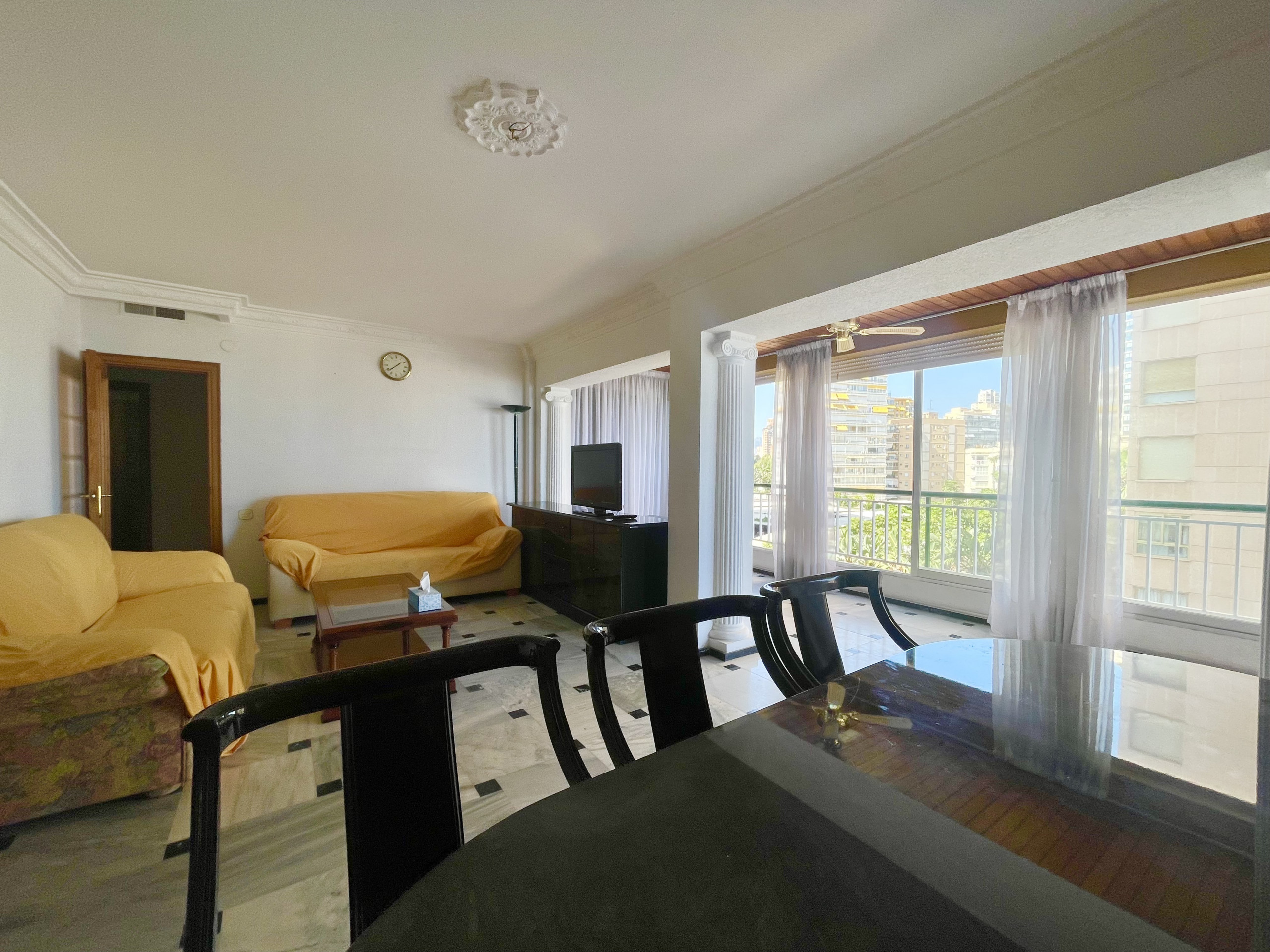 El apartamento en Benidorm posee 2 dormitorio(s) y capacidad para 6 personas. Alojamiento de 125 m² confortable y moderno, con vistas al mar. Está ubicado en una zona ideal para familias y junto al mar.Dispone de ascensor, lavadora, secador, parking aire libre en mismo edificio, 1 Televisor.La cocina independiente, eléctrica, está equipada con nevera, microondas, congelador, vajilla/cubertería, utensilios/cocina, cafetera, tostadora y hervidor de agua.