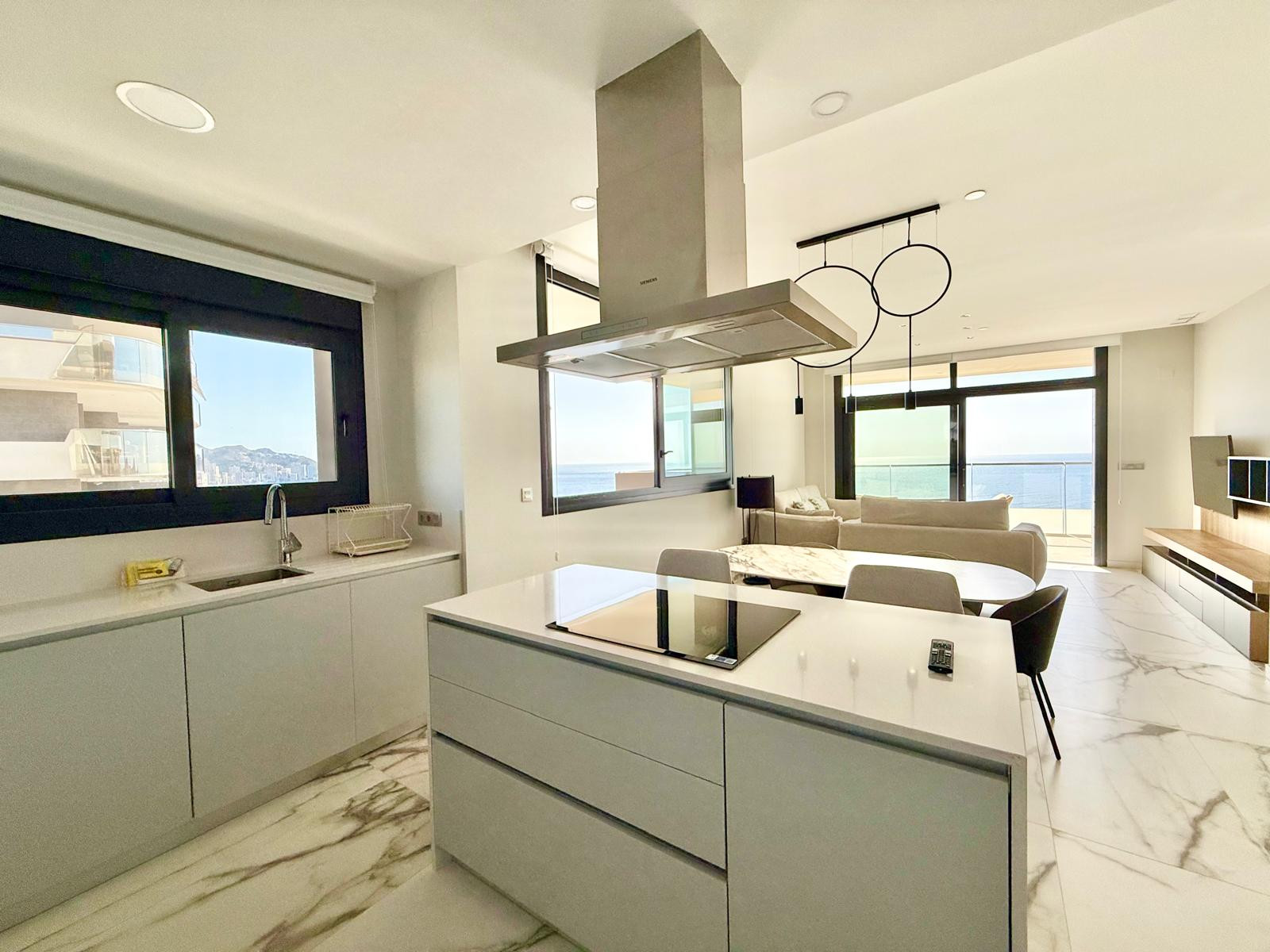 La cocina americana, de inducción, está equipada con nevera, microondas, horno, congelador, lavavajillas, vajilla/cubertería, utensilios/cocina, cafetera, tostadora y hervidor de agua.