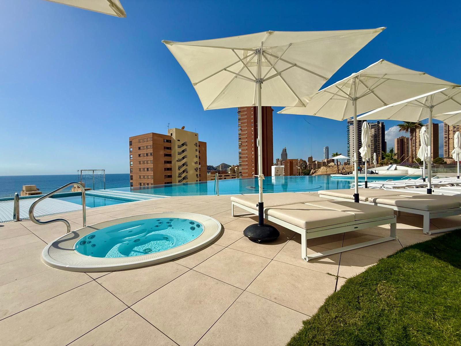 The accommodation is equipped with the following items: lift, 25 m² terrace, washing machine, iron, internet (Wi-Fi), hair dryer, tennis court, gym / fitness centre, heat pump, air conditioning throughout the house, communal+children's swimming pool, communal heated swimming pool, open-air parking the same building, 2 TVs.