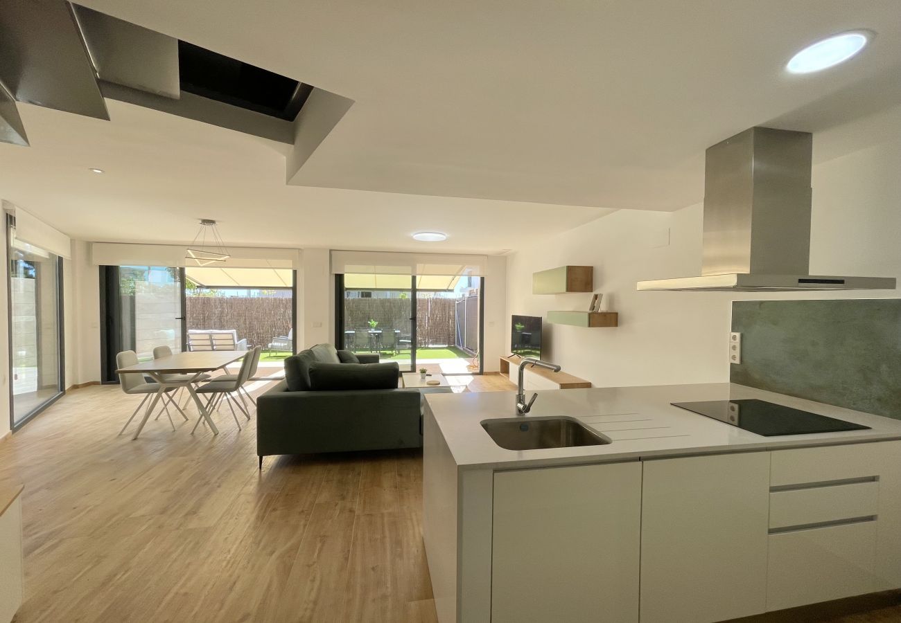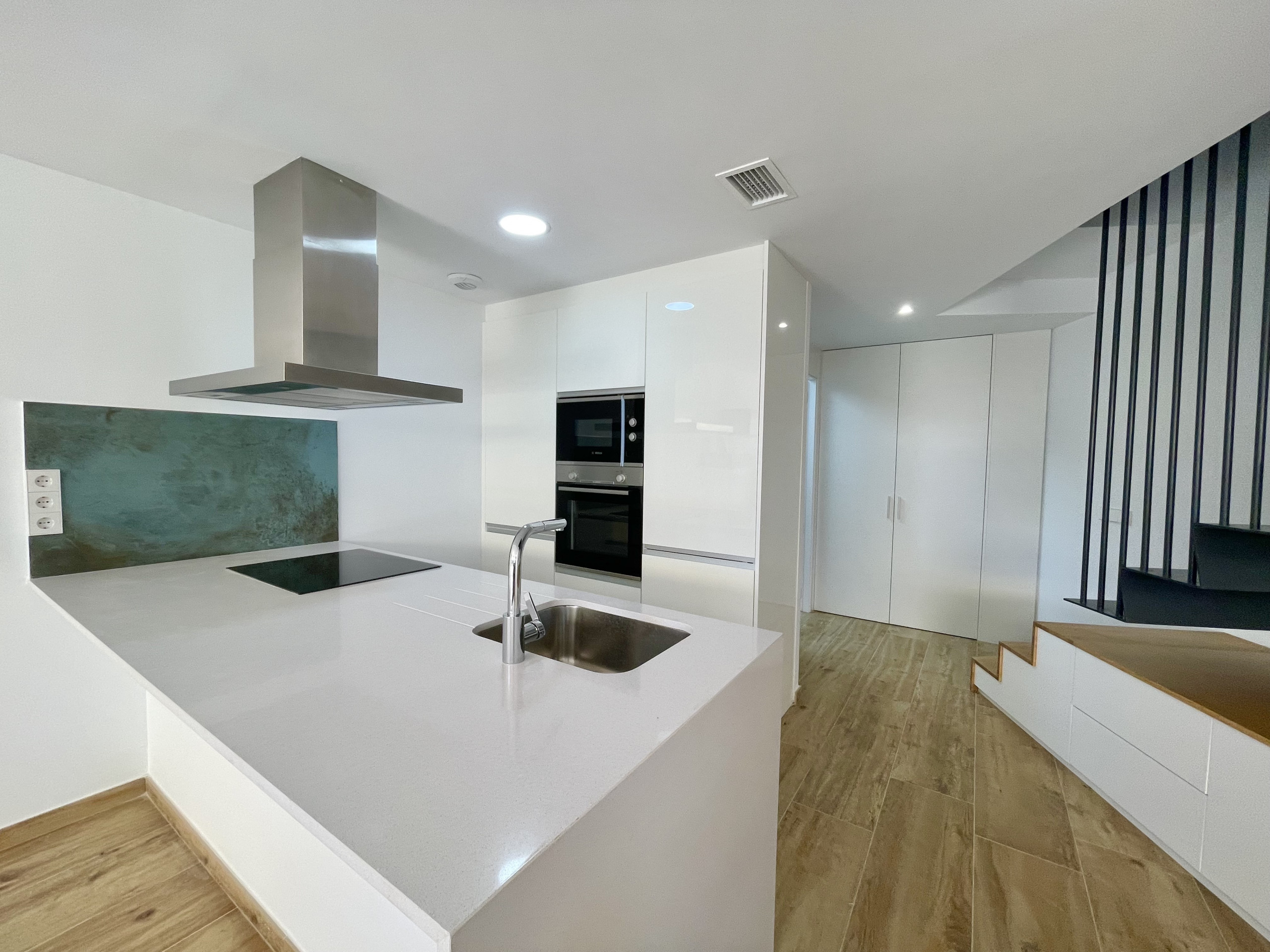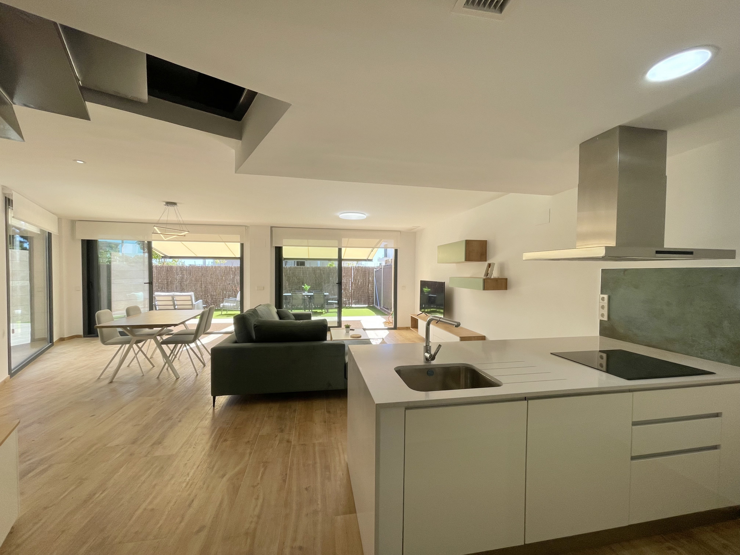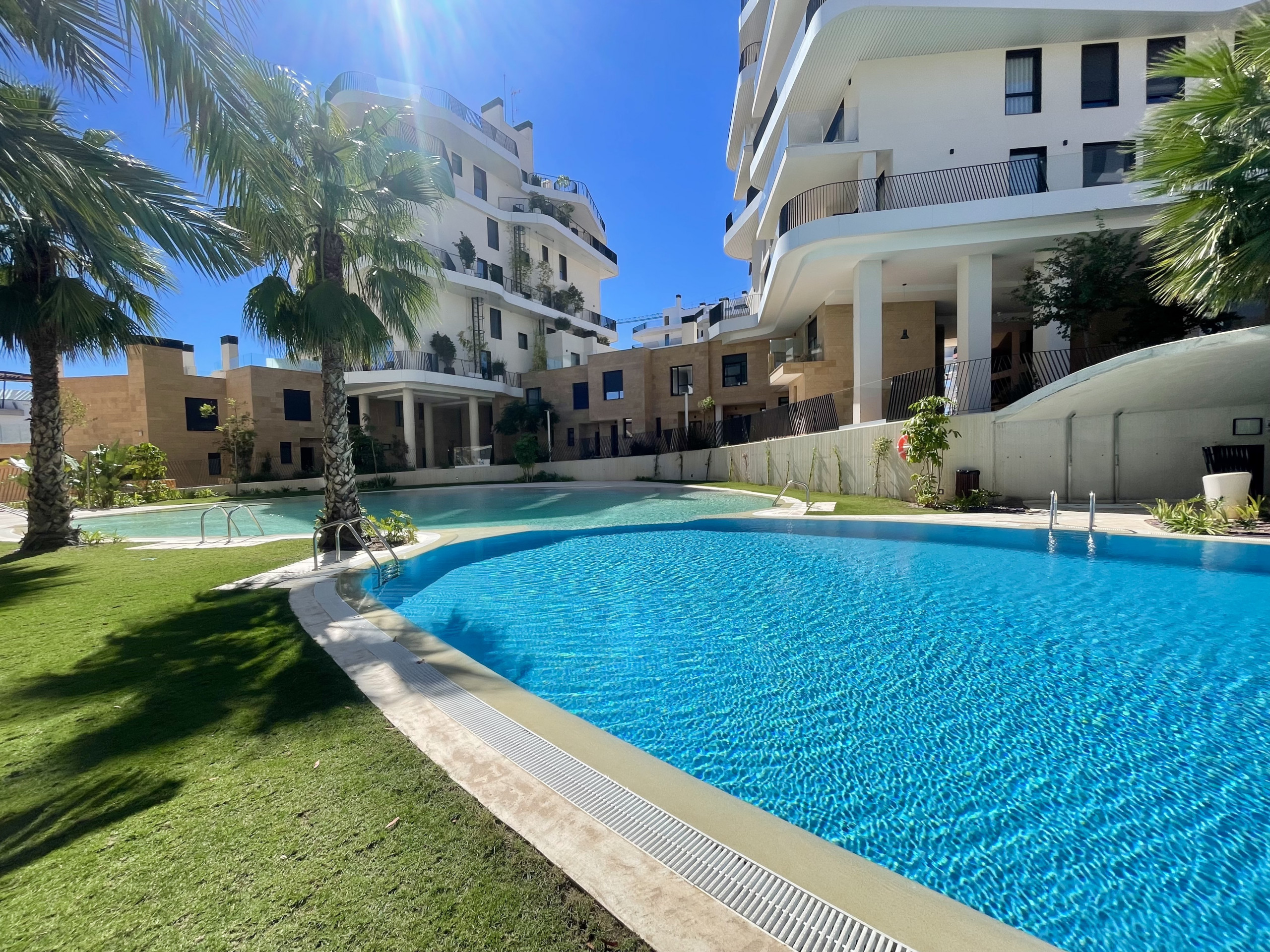 It has a garden, garden furniture, 20 m² terrace, iron, balcony, heat pump heating, air conditioning throughout the accommodation, communal + children's swimming pool, heated communal swimming pool, covered parking in the same building, 1 Television.