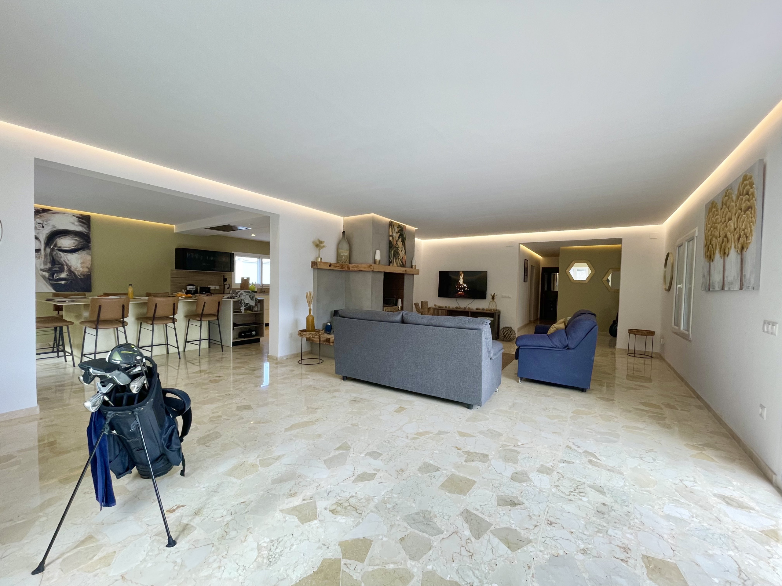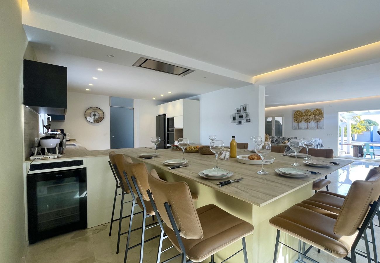The villa in Alfaz del Pí has 6 bedrooms and capacity for 12 people. Accommodation of 300 m² furnished with taste and spacious, with mountain views. It is located 2 km from the city "Alfaz del Pi", 2 km from the supermarket "Supermercado", 3 km from the restaurant "Playa del Albir", 4 km from the rocky beach "Playa del Albir", 7 km from the water park "Aqualandia", 8 km from the Golf course "Villaitana Golf", 8 km from the sandy beach "Playa de Benidorm - Playa de Altea", 8 km from the bus station "Benidorm", 8 km from the theme park "Terra Mítica", 65 km from the train station "Alicante", 70 km from the airport "Alicante" and is located in an ideal area for families and in the residential complex. It has a garden, garden furniture, terrace, washing machine, barbecue, fireplace, iron, internet access (wifi), air conditioning throughout the accommodation, private pool. The American kitchen, with ceramic hob, is equipped with fridge, microwave, oven, freezer, dishwasher, crockery/cutlery, utensils/kitchen, coffee maker, toaster, kettle and juicer.