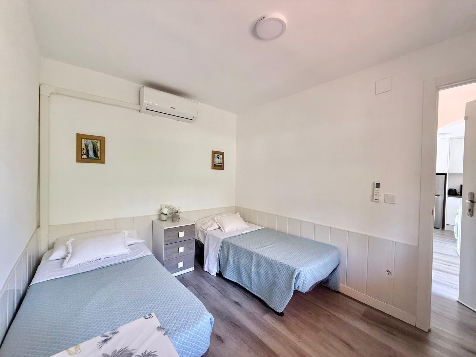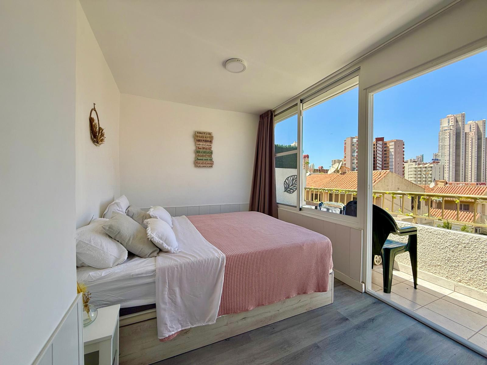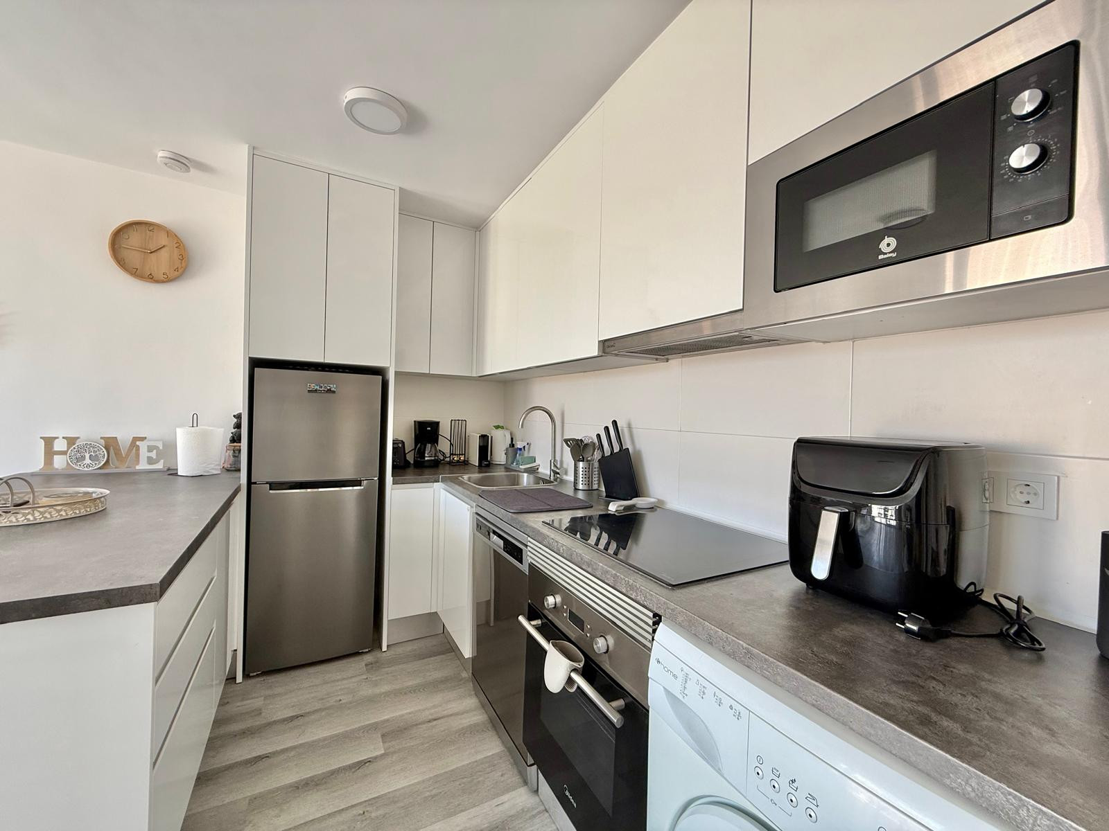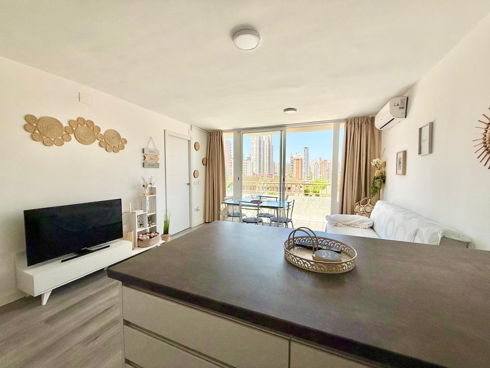 Appartement à Benidorm avec 2 chambres et capacité pour 5 personnes. Hébergement confortable et moderne de 50m2 avec vue sur le jardin et une terrasse de 10m2. Il est situé dans un complexe résidentiel et idéal pour une famille. Situé à moins de 10 minutes à pied de la plage de Levante et à 2 minutes à pied d'un supermarché. Il dispose d'un espace de télétravail, d'un lave-linge, d'un fer à repasser, d'un accès internet Wi-Fi, d'un sèche-cheveux, d'une télévision et d'une climatisation réversible. Vous trouverez la piscine commune et le parking dans la résidence. La cuisine ouverte avec plaque à induction est équipée d'un réfrigérateur/congélateur, d'un micro-ondes, d'un four, d'un AirFryer, de vaisselle/couverts, d'ustensiles de cuisine, d'une cafetière (classique et Nespresso), d'un grille-pain et d'une bouilloire.