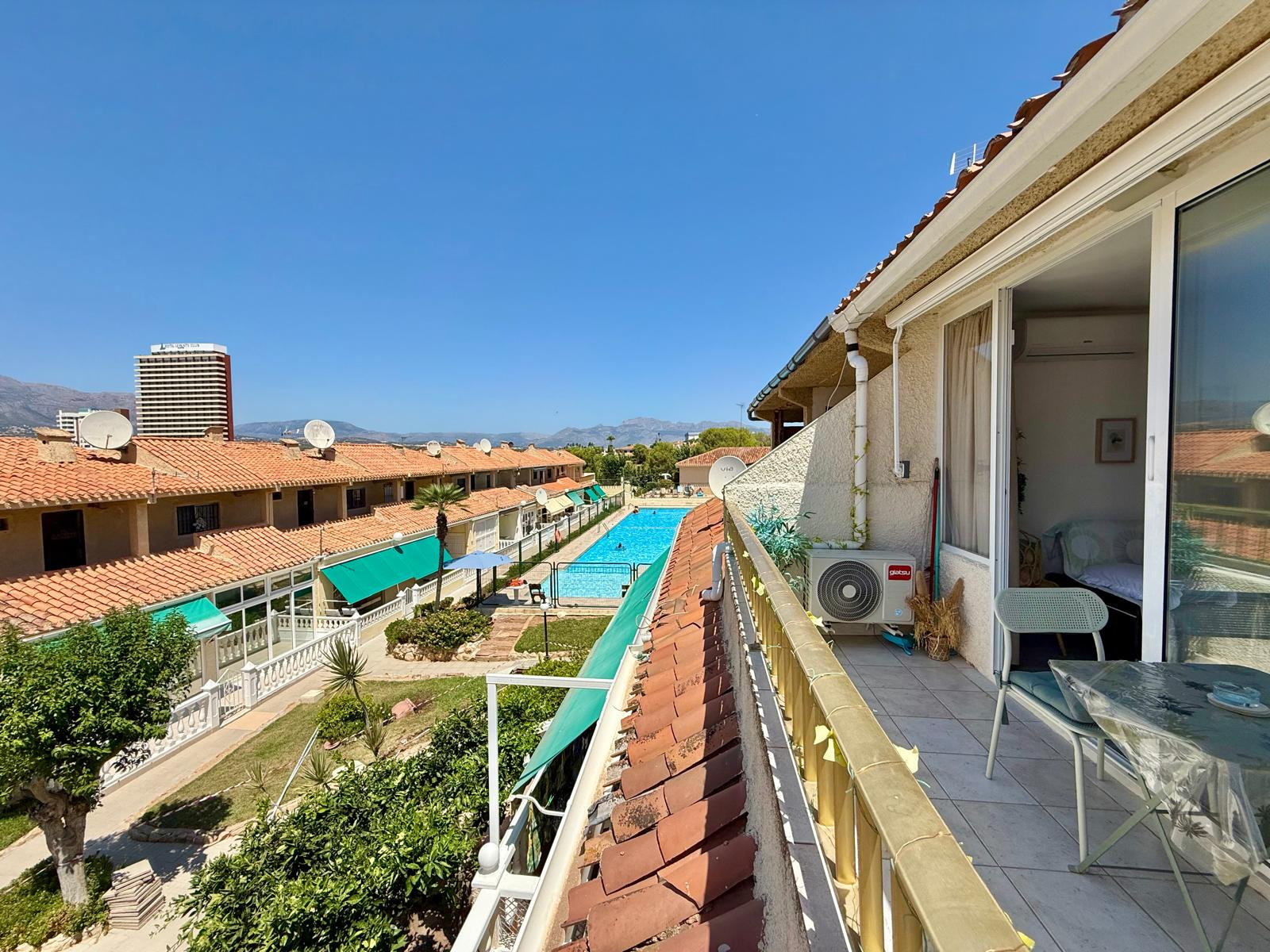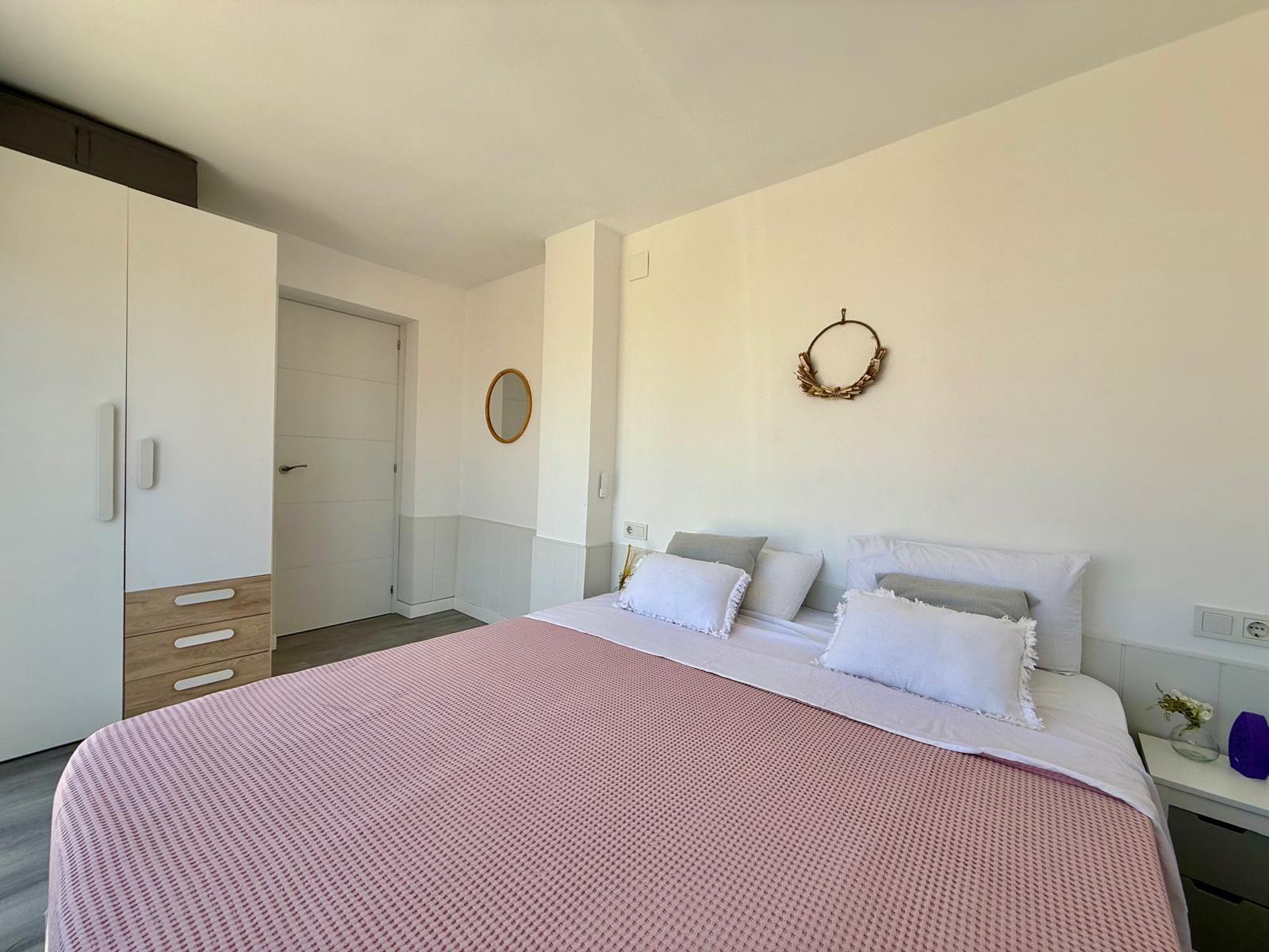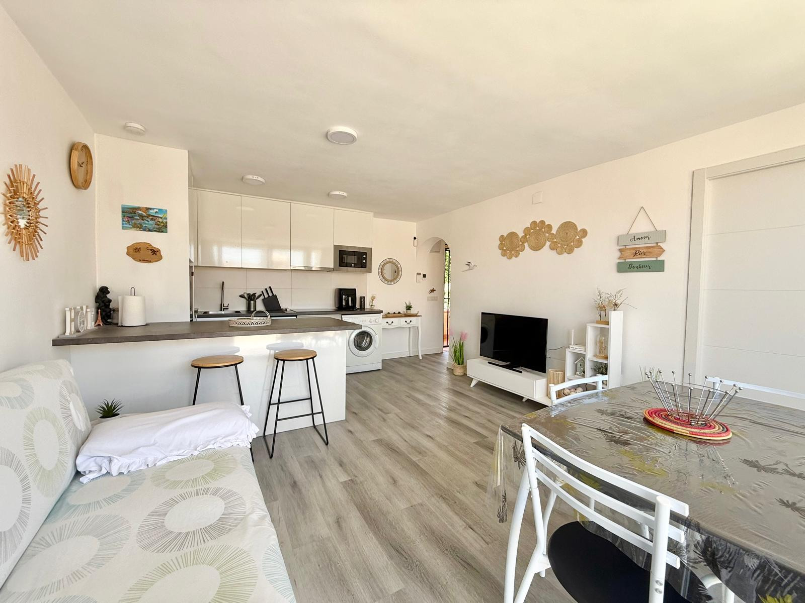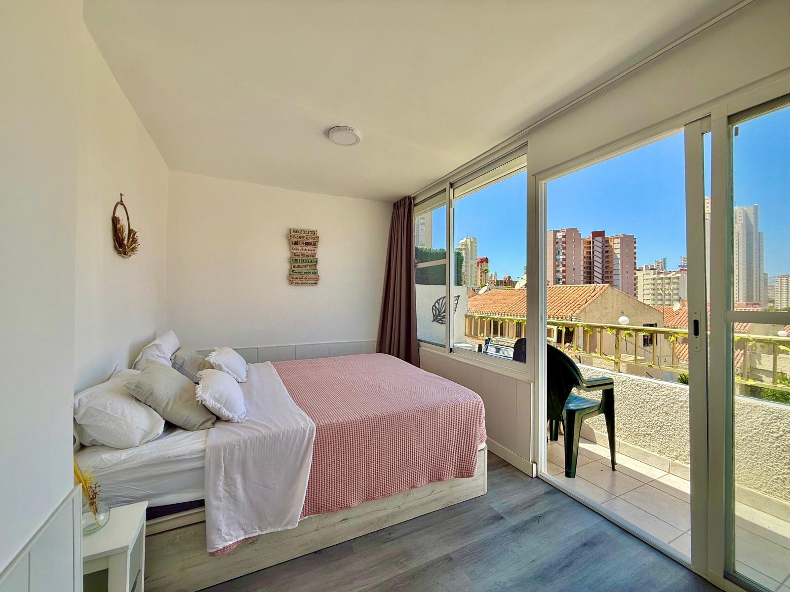 Appartement à Benidorm avec 2 chambres et capacité pour 5 personnes. Hébergement confortable et moderne de 50m2 avec vue sur le jardin et une terrasse de 10m2. Il est situé dans un complexe résidentiel et idéal pour une famille. Situé à moins de 10 minutes à pied de la plage de Levante et à 2 minutes à pied d'un supermarché. Il dispose d'un espace de télétravail, d'un lave-linge, d'un fer à repasser, d'un accès internet Wi-Fi, d'un sèche-cheveux, d'une télévision et d'une climatisation réversible. Vous trouverez la piscine commune et le parking dans la résidence. La cuisine ouverte avec plaque à induction est équipée d'un réfrigérateur/congélateur, d'un micro-ondes, d'un four, d'un AirFryer, de vaisselle/couverts, d'ustensiles de cuisine, d'une cafetière (classique et Nespresso), d'un grille-pain et d'une bouilloire.
