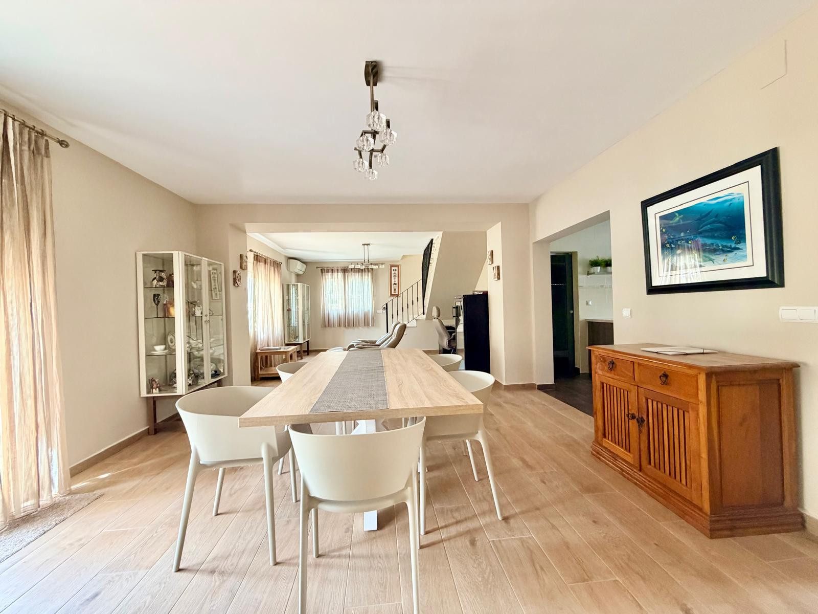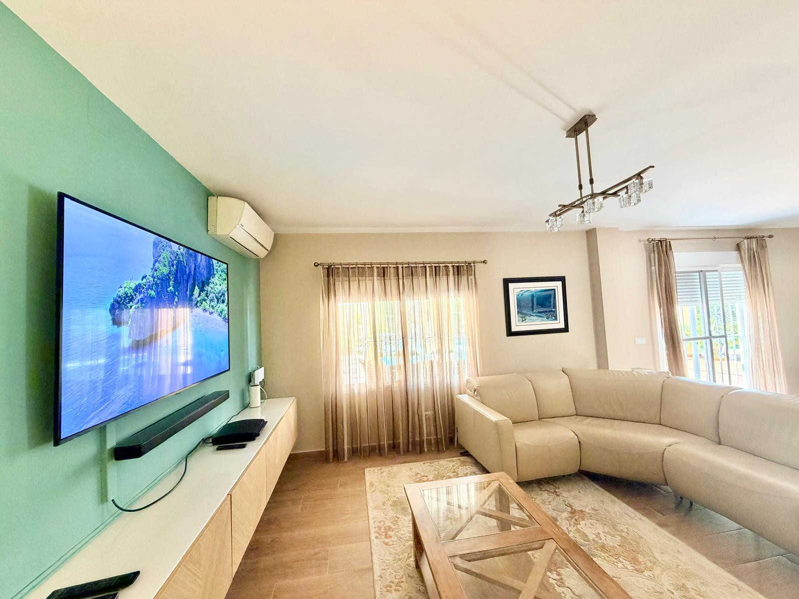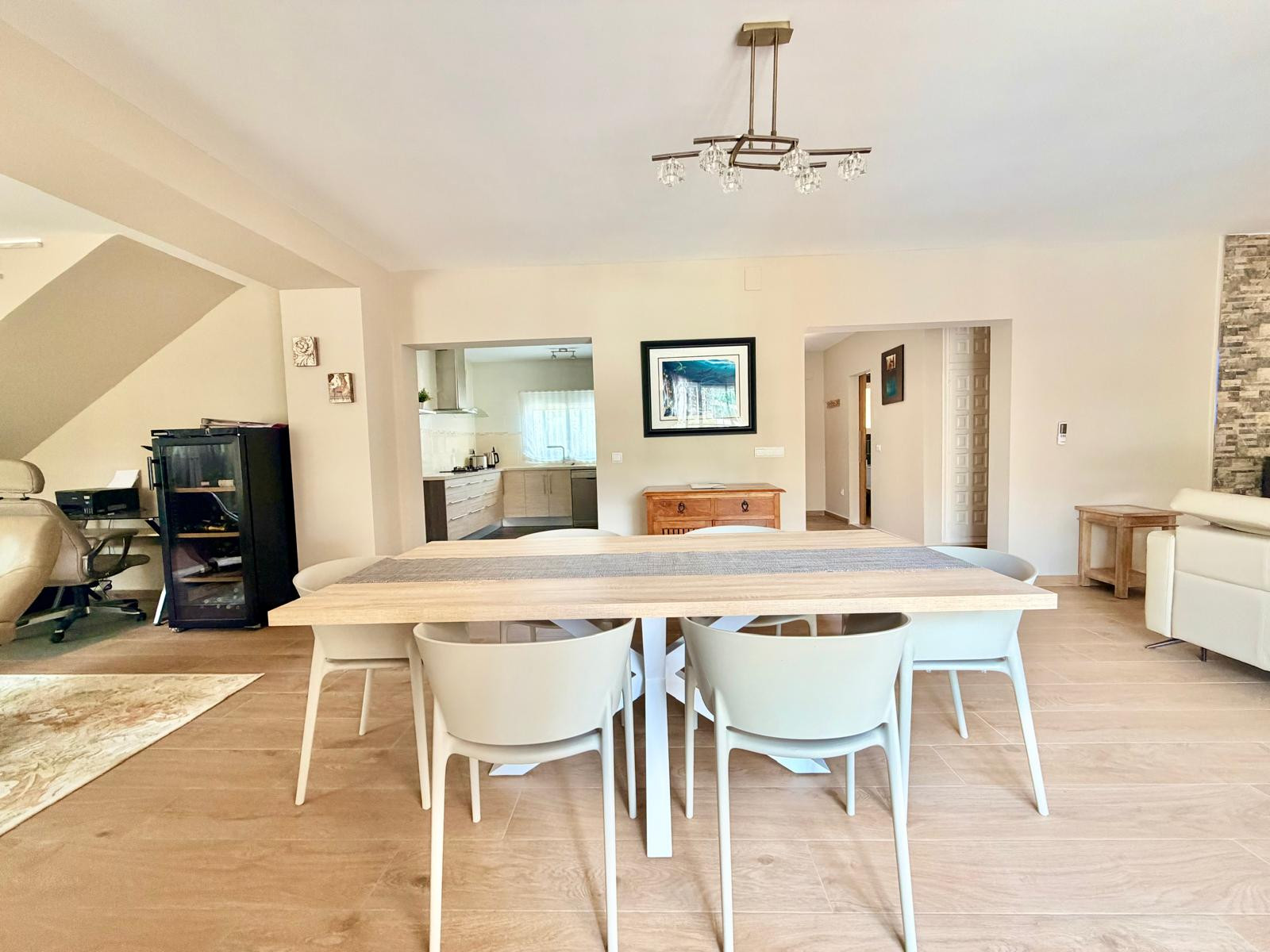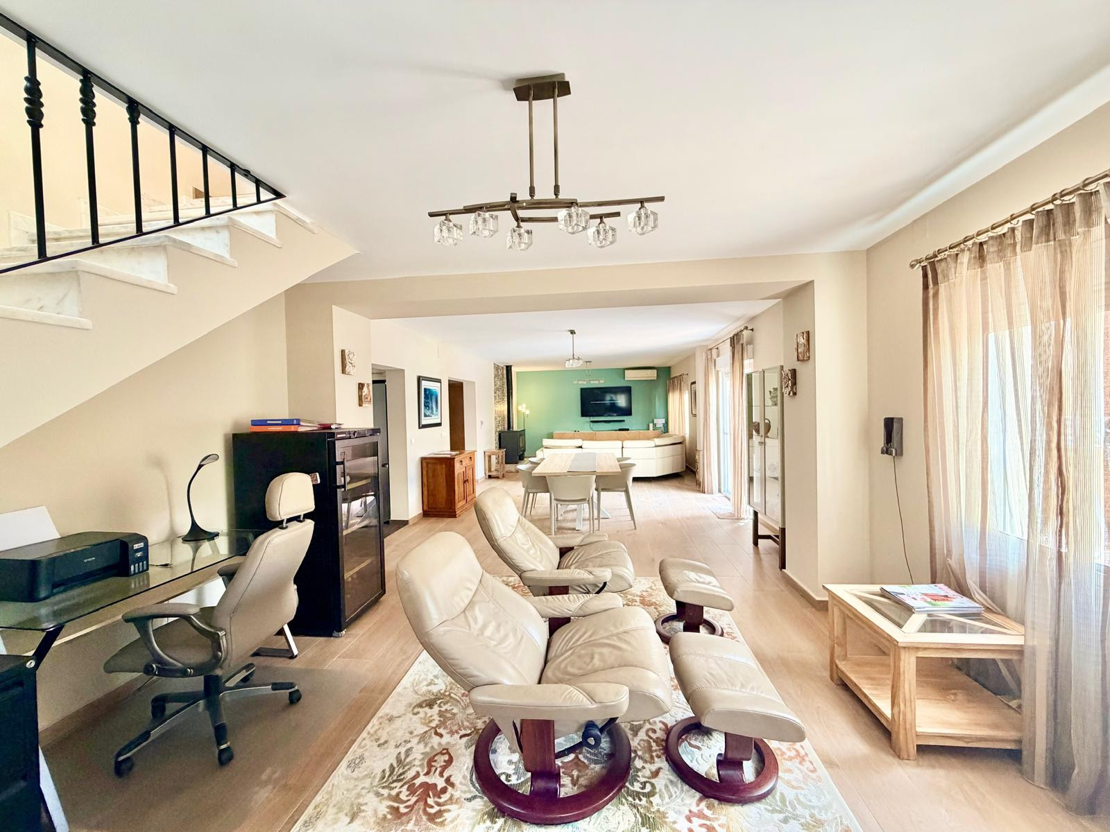 La maison, avec 300 m2 de superficie, est répartie sur deux étages. Le rez-de-chaussée dispose d'un magnifique hall d'entrée avec des toilettes de courtoisie, une grande chambre avec un lit double, des armoires encastrées et une télévision à plasma. Le hall d'entrée donne accès à un immense salon-salle à manger avec des canapés et des fauteuils confortables en cuir, une télévision à plasma, une cheminée et une table de salle à manger avec des fauteuils en cuir. Le salon a un accès direct à la zone extérieure et à une cuisine moderne entièrement équipée.