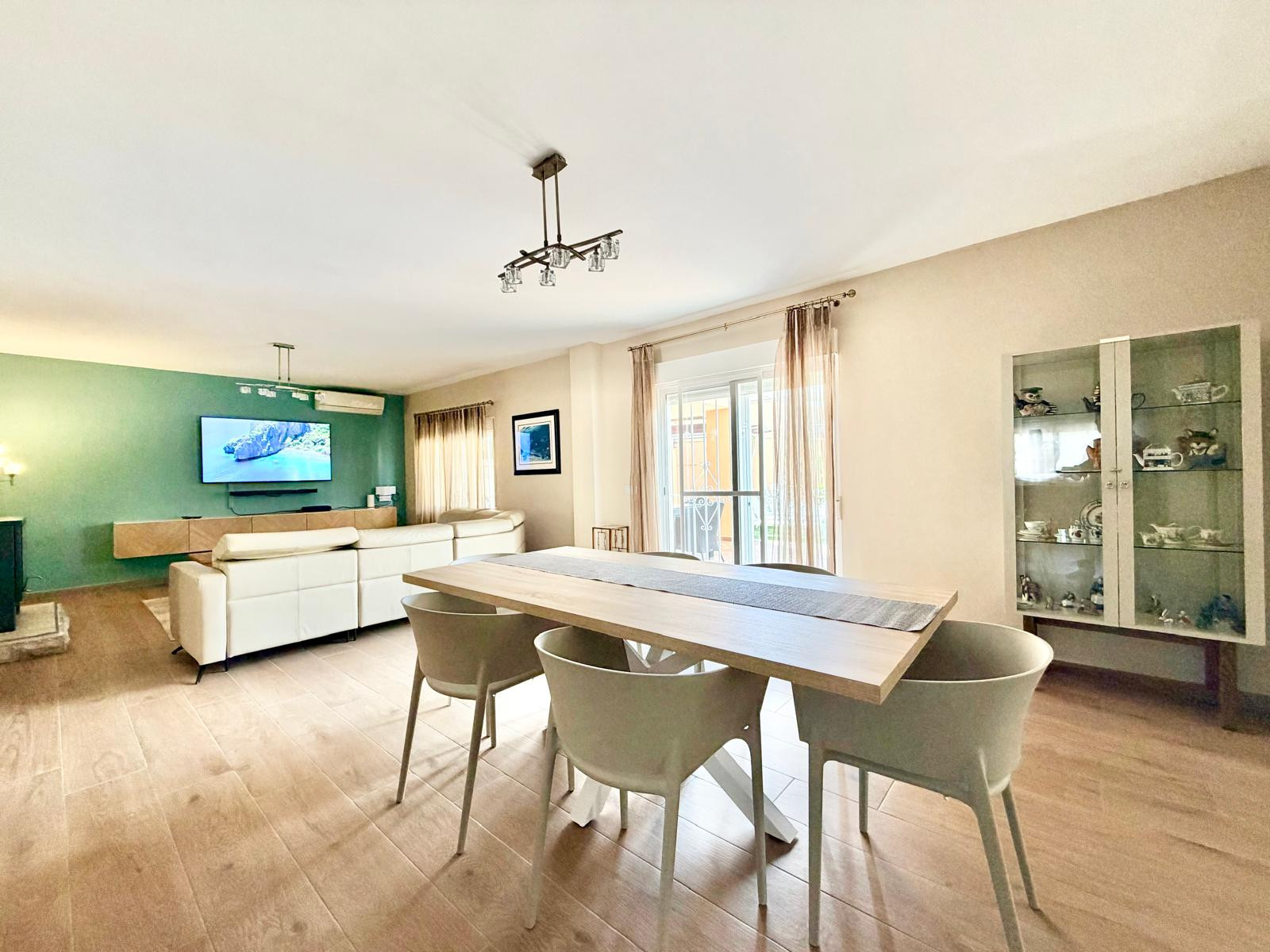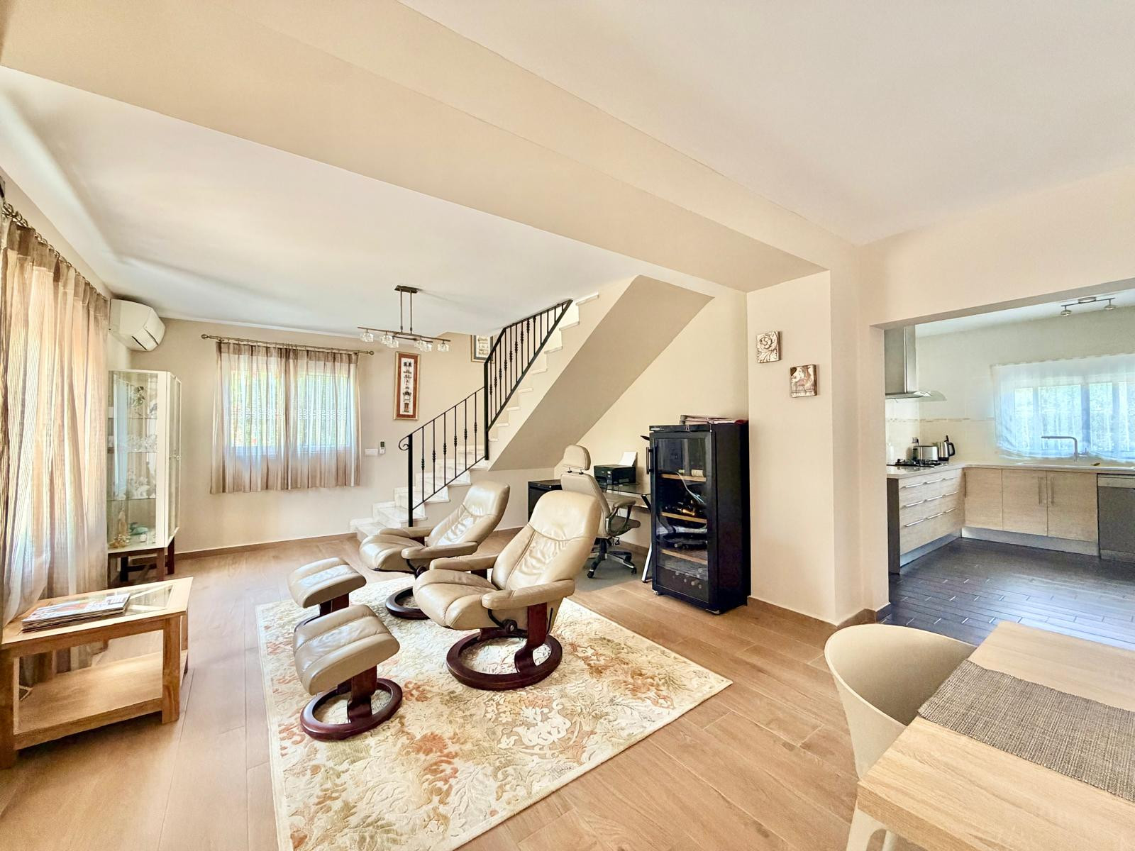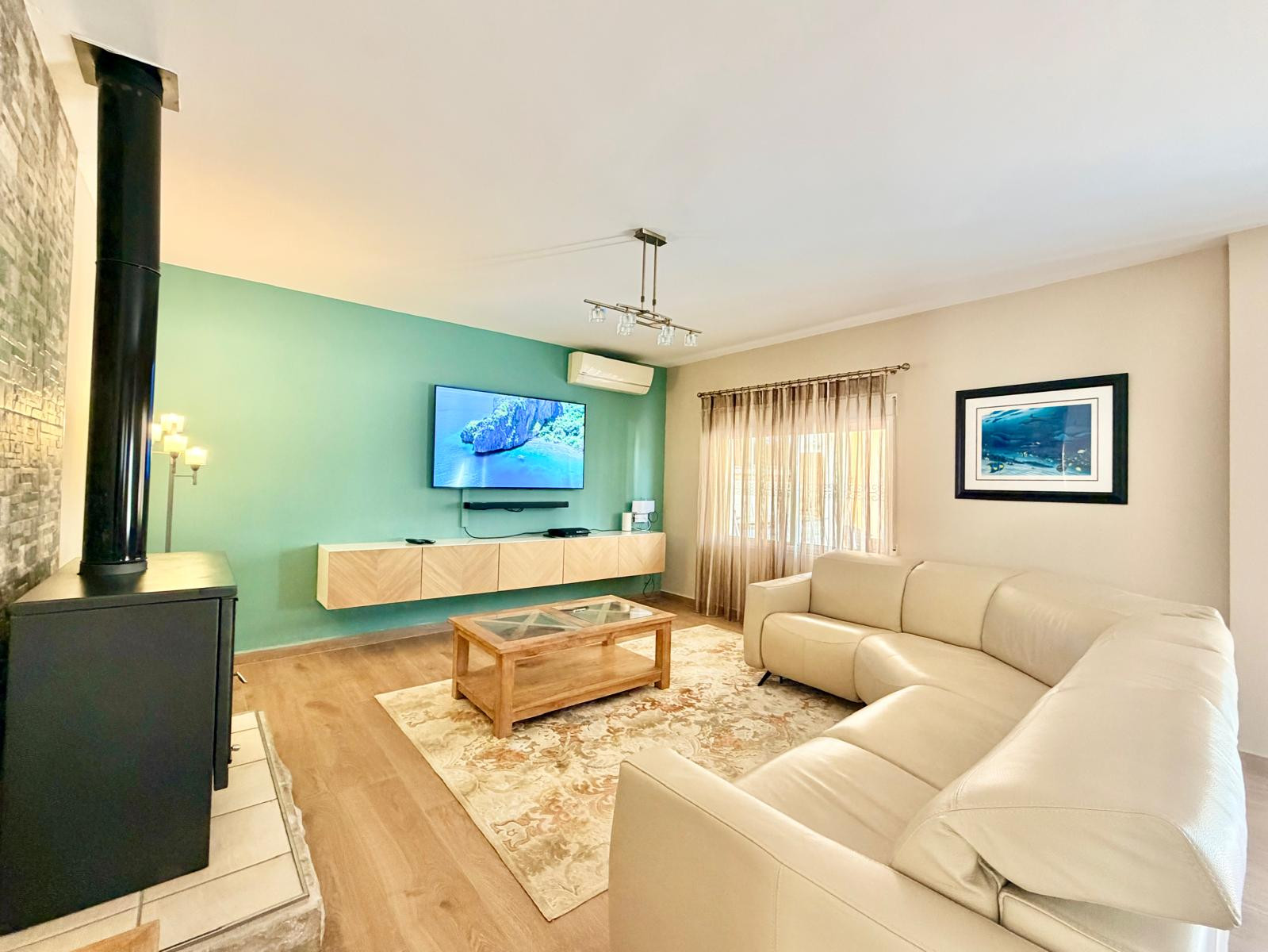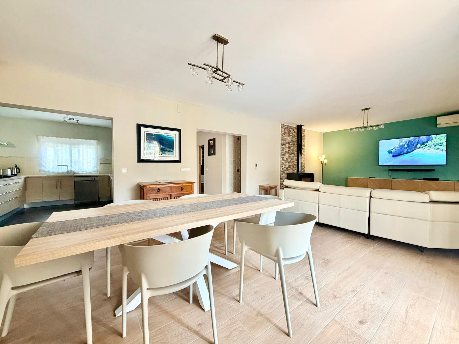 La maison, avec 300 m2 de superficie, est répartie sur deux étages. Le rez-de-chaussée dispose d'un magnifique hall d'entrée avec des toilettes de courtoisie, une grande chambre avec un lit double, des armoires encastrées et une télévision à plasma. Le hall d'entrée donne accès à un immense salon-salle à manger avec des canapés et des fauteuils confortables en cuir, une télévision à plasma, une cheminée et une table de salle à manger avec des fauteuils en cuir. Le salon a un accès direct à la zone extérieure et à une cuisine moderne entièrement équipée.